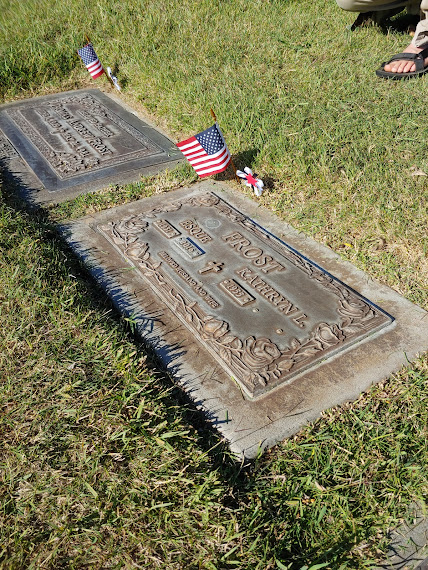 My great uncles Thomas and Esque Frost are buried here. It was Esque who inspired us to visit. We all knew and love Esque. (Their older sister, my grandmother, Aurora Marie Frost McGinness, was cremated and supposedly scattered over the forest in the Sierra Nevadas. Unfortunately, years later it was discovered that some of the contractors did not scatter the ashes as hired, but dumped them in some yard.) We will think of her is being in the beautiful places she loved. Well, really, I will think of her as being in much more beautiful place.